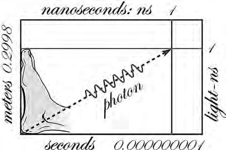 Noticethat,inthevacuum,inananosecond9lighttravelsadistance ofaboutonefoot(29.9792458cm,tobeexact).IfIweretodefine“my royalfoot”aspreciselythatdistance,thespeedoflightwouldbe,in unitsof(myroyal)feetpernanosecond, preciselyc = 1.Afairlyeasynumbertoremember.Moreover,with c = 1,theunitsoftime(nanoseconds) anddistance(nanosecondsoflighttravel)areessentiallythesame,see Figure4.Setting c = 1isevenbetterthanmeasuringmaritimedistances