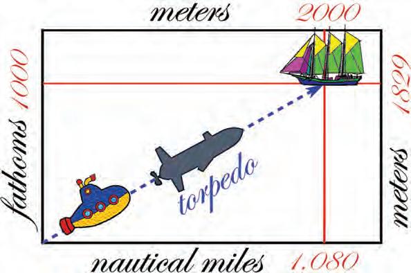 Figure5 Themeasurementofdistancesingoodoldunits(fathomsandnauticalmiles)orinmeters.Thehorizontalandverticalscalesareallfordistances,in thevariousunits.Ship:https://pixabay.com/en/ship-boat-sailing-travel-ocean29244/Submarine:https://pixabay.com/en/amarillo-blue-el-mar-mar-sea-sub1300164/. anddepthsinkilometersasopposedtonauticalmilesandfathoms; trytofigureout,usingthelatterpairofunits,thedistancefromyour submarinetoashipatwhichyouareaiminga(dummy!)torpedo.By thetimeyouaredone,theshipisgone.Theunitstobenaturallyused fortorpedoesandshipsareillustratedinFigure5.