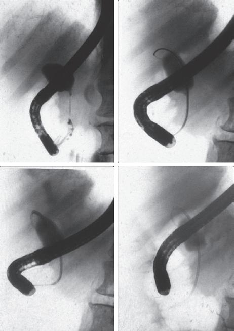 technique that further expanded the endoscopist’s therapeutic armamentarium. Long, flexible balloon-tipped catheters, basket catheters, stone-grasping forceps, and endoscopic laser or ultrasound stone disintegrators were miniaturized to fit through the endoscope working channel, and removal of bile duct stones no longer required surgical laparotomy and open choledochotomy.