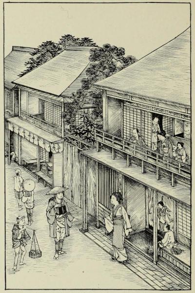 It was late at night on the second day before Sennoske arrived at Mishima, at the foot of the other side of the mountains. The town was full of people; for besides the ordinary contingent of travellers, who always muster here in force, there were a great many samurai —some who had started too late to join the army, others, like Sennoske, already returning home—and a considerable number of Hōjō adherents fleeing in various disguises to find an asylum before pursuit was fairly organized against them. The inns and hostelries were over-crowded; but the Kuwana nobility had always enjoyed a good reputation on the road, and the charm of the young man’s manner moreover failed not in its usual effect; so at the inn at which he determined to stay, two parties of merchants, already closely packed, were forced to content themselves with even less space in order to clear a room for the new arrival. Sennoske, who was weary, at once repaired to the bath, accompanied by Yamagawa, carrying the Muramasa sword, which was never out of sight or reach of either master or servant.