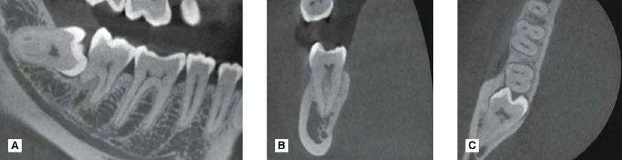 FIG. 1.2 Modern cone beam computed tomography (CBCT) radiographic images in three dimensions of the lower right molar teeth in the (A) sagittal, (B) coronal and (C) axial planes.