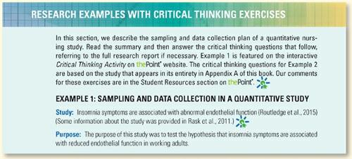 ResearchExamplesandCriticalThinkingExercises.Eachchapterconcludeswith oneortwoactualresearchexamplesdesignedtohighlightcriticalpointsmadeinthe chapterandtosharpenthereader’scriticalthinkingskills.Inaddition,manyresearch examplesareusedtoillustratekeypointsinthetextandtostimulatestudents’ thinkingaboutareasofresearchinquiry.Wehavechosenmanyinternational examplestocommunicatetostudentsthatnursingresearchisgrowinginimportance worldwide.SomeoftheCriticalThinkingExercisesfocusonthefull-lengtharticles inAppendixA(aquantitativestudy)andAppendixB(aqualitativestudy).