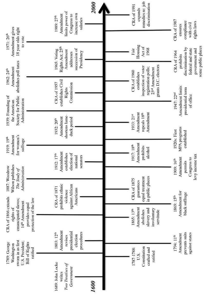 The Constitution does not provide guidance on how to administer the government. It was up to Washington to chart the course. With great latitude, an eye over the horizon, and no historical precedent, Washington started the process to establish “a public administration” that would implement the system that was sketchily outlined in the Constitution. The creation of a democratic republic has been in process ever since. Attempts to regularize processes are structured in administrative law. This is what provides interpretation and meaning to constitutional precepts. Attempts to advance political equality are marked by the passage of nine civil rights acts,4 each extending protections to people categorized by demographic characteristics. In addition to trying to level the playing field for citizens, there have also been ongoing attempts to reconcile the debate about whether patronage or formal, merit-based selection processes should be used to hire civil servants. The latter prevailed and by the late 1800s, Congress approved The Pendleton Act, a bill that standardized the process for recruiting and hiring federal workers and protected them from partisan firing. By the 1930s, parallel processes for recruiting and hiring personnel were being implemented in states and cities.