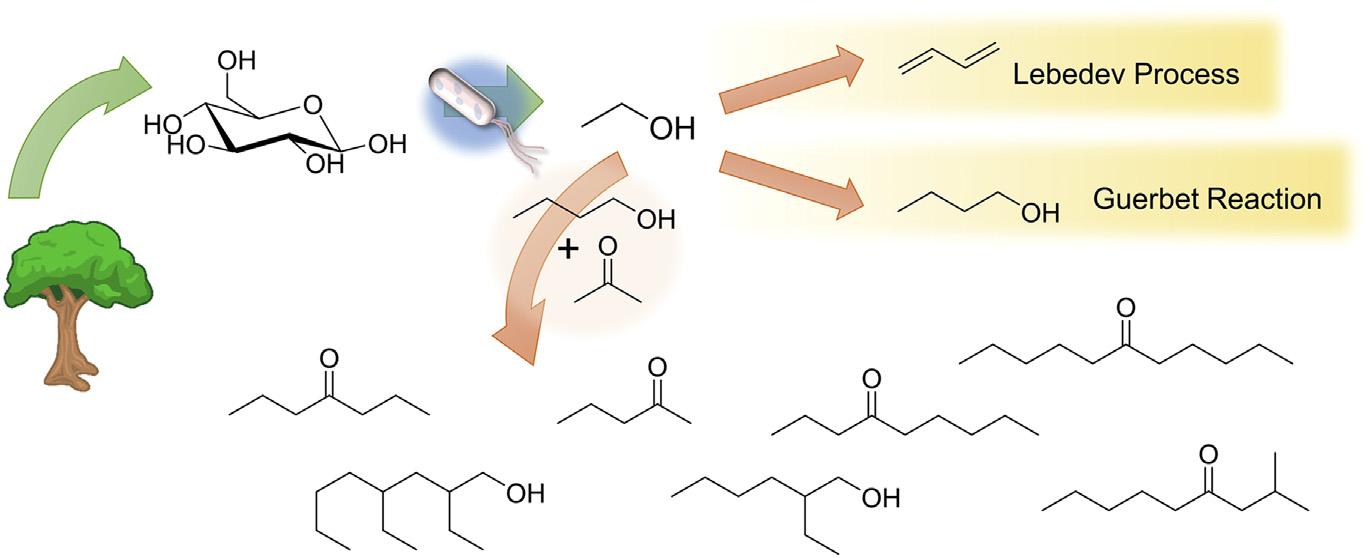Withtheresurgenceofinterestinbiorenewablefuelsinthefirsttwodecadesofthe 21stcentury,therehasbeenacorrespondinginterestincarbon carbonbond formingreactions.Althoughcarbon carbonbondformationisnotnewinethanol processing(seethediscussionmentionedearlierontheLebedevandGuerbet reactions),someprocesseshavebeendevelopedthatincorporateethanolwithother biomass-derivedsmallmolecules.Notableamongtheseprocessesistheworkofthe TosteandBellgroups,whohavedevelopedroutestonewbiobasedlubricantsand long-chainhydrocarbonfuelsusingthemixtureofacetone,butanol,andethanol producedduringacetone butanol ethanolfermentation(GoulasandToste,2016).