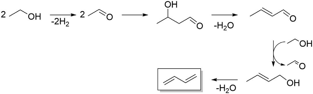 Oneofthemorepromisingchemicalsthatcanbeproducedfromethanolisbutadiene.Butadieneisanimportantbuildingblockfortheproductionofpolymers suchasStyrene ButadieneRubber,polybutadiene,andstyrenebutadienelatex. Approximately95%ofbutadieneiscurrentlyobtainedasaby-productofthe naphthacrackingprocessusedtoproduceethylene.However,therearedownsides tothisrouteasaresultofthecomplex,expensiveseparationprocessthatrequires severalextractivedistillationsteps.Moreover,asdiscussedearlier,inthefirsttwo decadesofthe21stcentury,therehasbeenashifttowardlighterfeedstocksfor ethyleneproductionintheUnitedStates,whichhasledtoadecreasedoutputof butadieneandputpressureonthatmarket.Consequently,attentionhasshifted towardtheuseofalternativerenewableresourcesfor“on-purpose”butadiene synthesis.