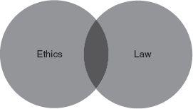 The leftmost part of the figure represents acts that are ethically wrong but legally permitted The dark gray area represents acts that are illegal and unethical, and so on The size of each area may not reflect the actual number of elements in each set