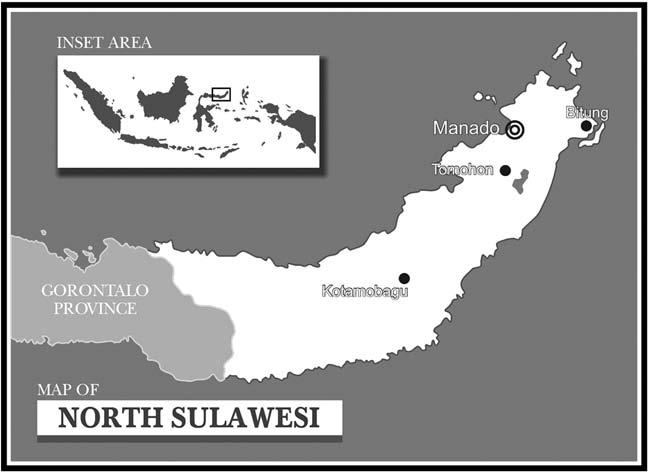 Words in Indonesian (Bahasa Indonesia) are designated by italics, except for proper nouns. Words in Manadonese (referred to as Bahasa Manado or Melayu Manado), a local form of Malay, are also italicized with the qualifier “Manado” preceding the italicized words. All translations from these languages are my own, unless otherwise specified.