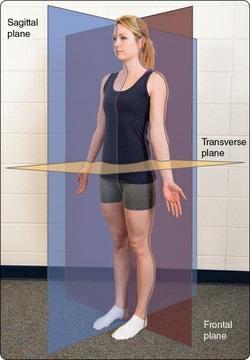 From the anatomical reference position, we can define three anatomical planes (figure 1.2). Anatomical planes are imaginary planes that separate the body into left and right (sagittal), top and bottom (transverse), and front and back (frontal). At times, the sagittal plane is referred to as the anterior–posterior plane, and the frontal plane is referred to as the coronal plane. These planes of reference are useful when describing postural positions (chapter 4) and common movement patterns (chapter 6).
