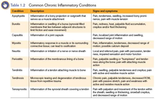 Chronic injuries, on the other hand, usually have a gradual onset and are of prolonged duration. Many times the exact mechanism or time of injury is not known. Chronic injury usually results from an accumulation of minor insults or repetitive stresses that would not be sufficient to cause injury if the same stress or insult were applied in an isolated event. Consequently, chronic injuries are primarily inflammatory conditions in which the demands on the tissue exceed its ability to heal and recover before additional stress is applied. Common inflammatory conditions are listed in table 1.2. Chronic injury often occurs following periods of inadequate rest or recovery, overuse of a muscle or body part, repetitive overloading of a structure, or repetitive friction between two structures. As such, these injuries may also be referred to as overuse injuries. Chronic injuries are often more difficult to treat than acute injuries, as the longer the pathologic state continues, the longer it takes for healing to occur and symptoms to subside.