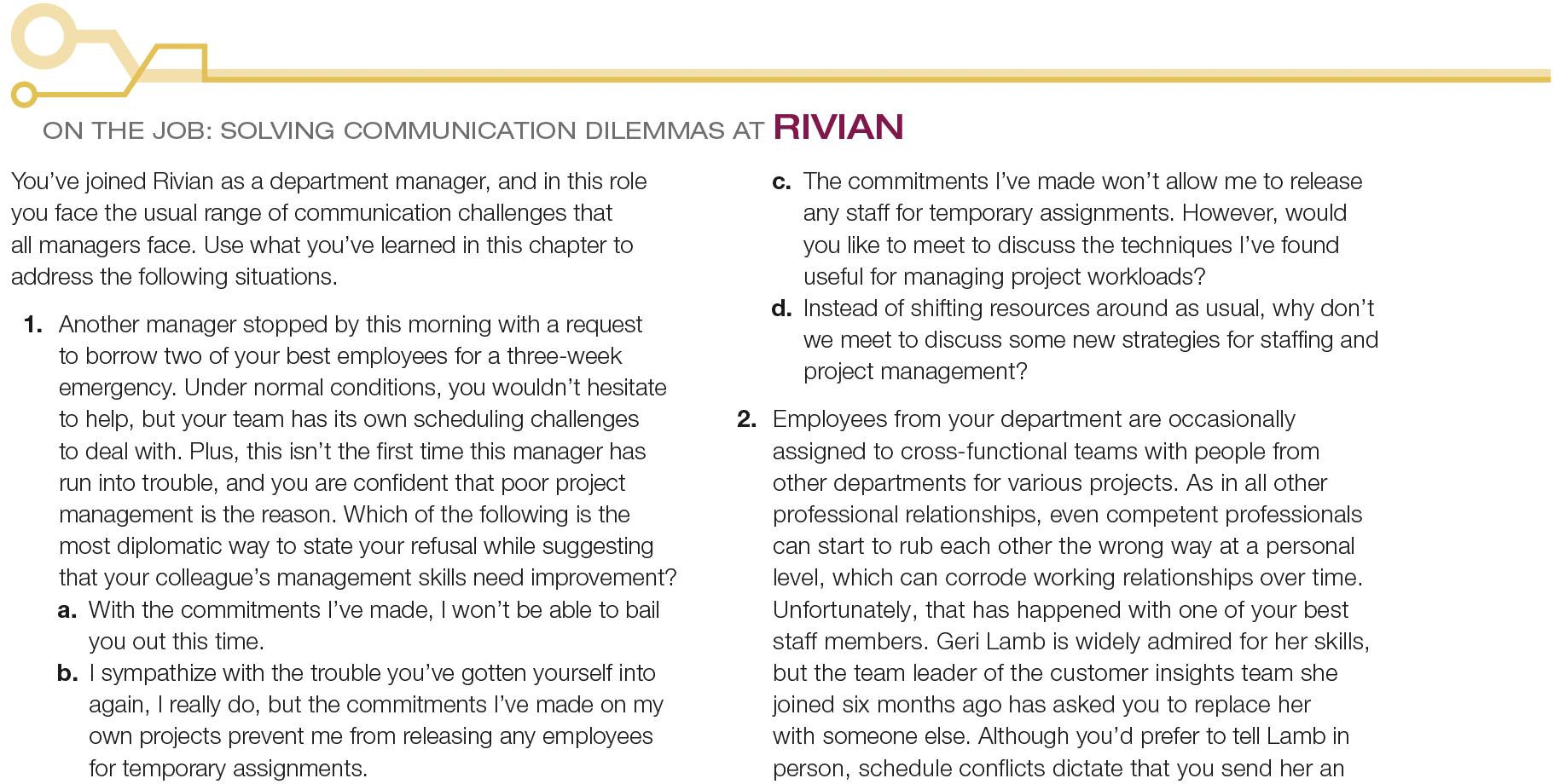 Each chapter opens with a brief vignette that describes a challenge or opportunity faced by a business professional, emphasizing concepts and valuable skills that students will explore in the chapter. The story from the chapter-opening vignette is picked up again at the end of the chapter in a unique simulation that has students imagine themselves in that company as they face four communication challenges that require them to use their new skills and insights.