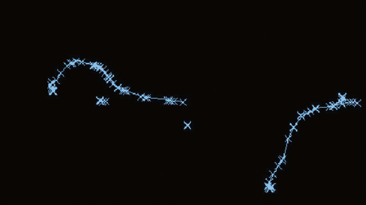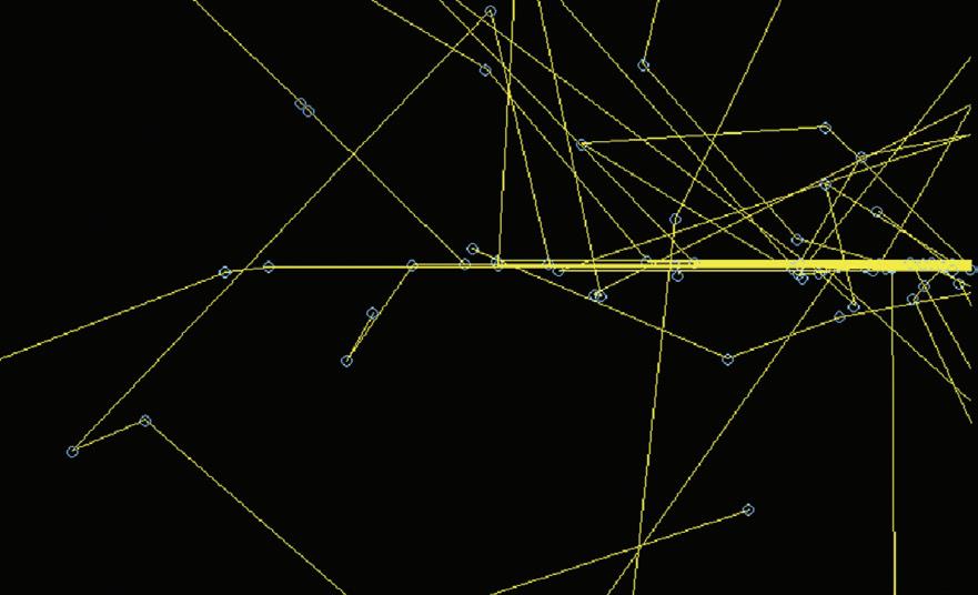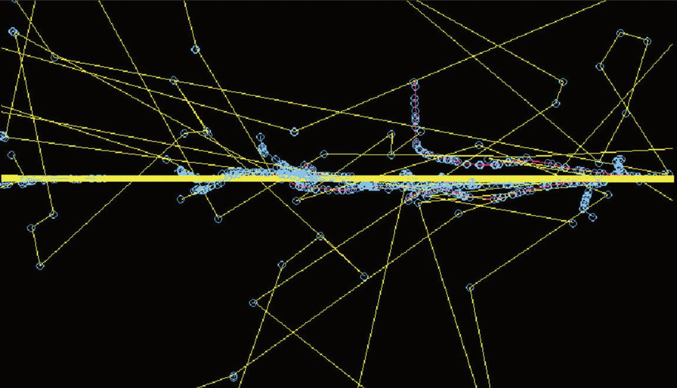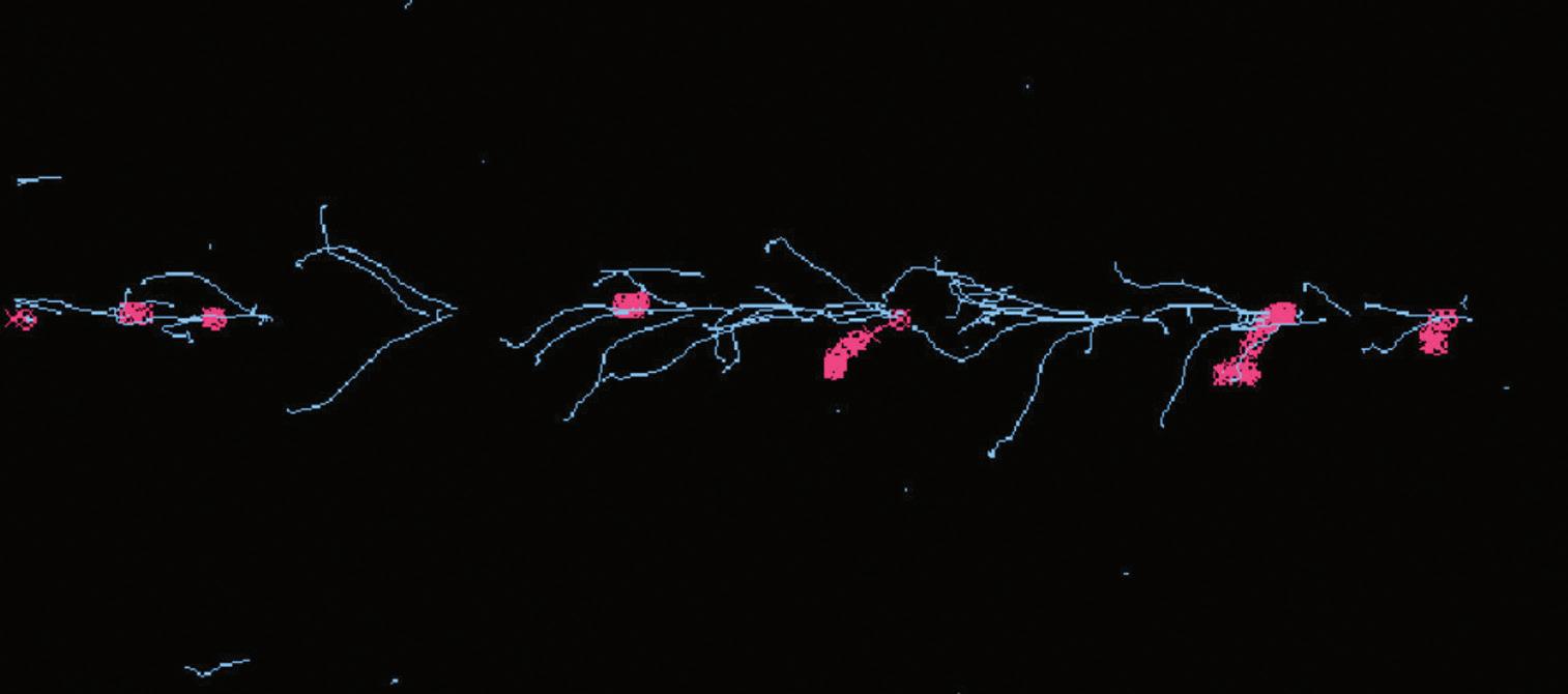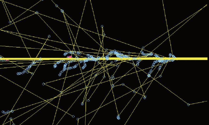 Fig. 2.6 Monte Carlo simulation showing electrons produced from interactions of 6 MV photons. Note the tortuous paths and the increased number of interactions (each shown by a blue cross) as the electron reaches the end of its range and has only a low energy.