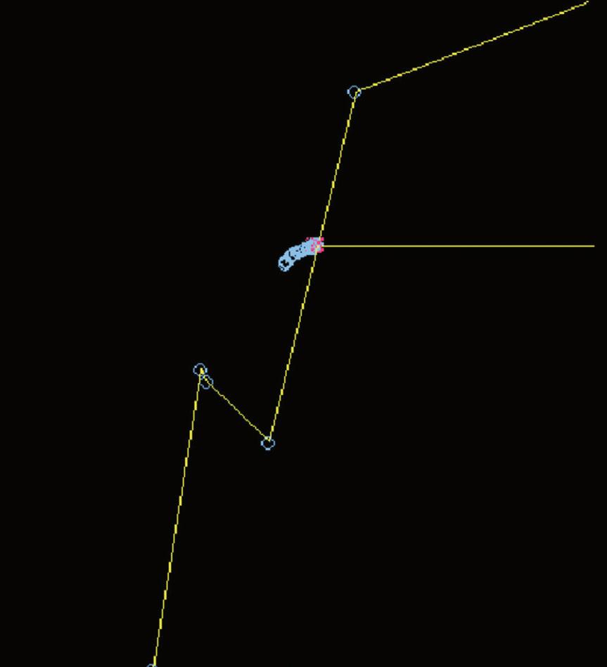 Fig. 2.4 Monte Carlo calculation of twenty-five 20 MV photons incident on a 20-cm water slab. The yellow lines show the photons, the blue lines and circles the electrons, and the red lines and crosses the positrons. Some of the photons do not interact before leaving the slab and the scattered photons and electrons are predominately in the same direction as that of the incident photon. There is an increase in pair production and the positrons travel further before being annihilated. Many of the photons outside of the beam are the result of this process (e.g. the track traced in green is the result of a single annihilation process).