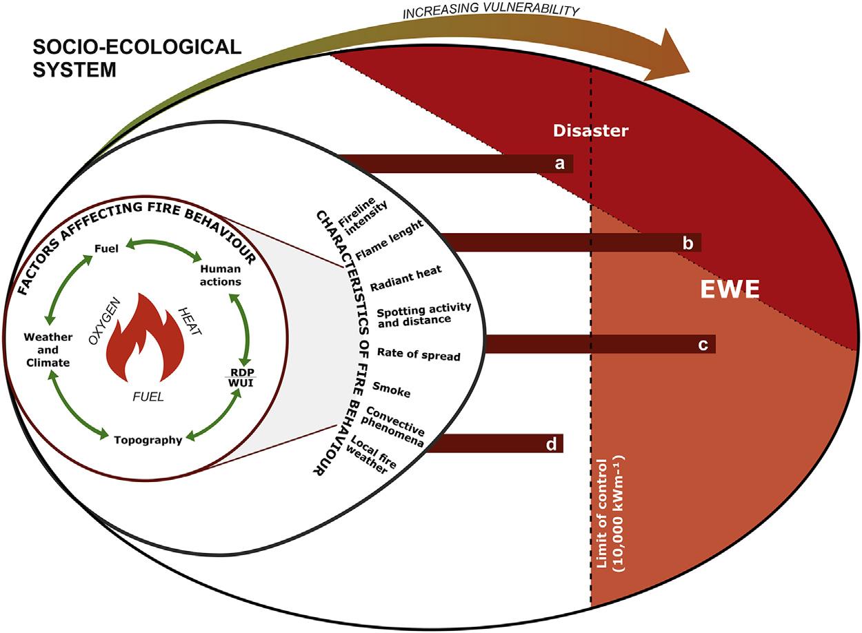 ThedefinitionofEWEsbyTedimetal.([31],p.10)is: “apyro-convectivephenomenonoverwhelmingcapacityofcontrol(firelineintensitycurrentlyassumed 10,000kWm-1;rateofspread >50m/min),exhibitingspottingdistance > 1km,and erraticandunpredictable firebehaviorandspread. Itrepresentsaheightenedthreat tocrews,population,assets,andnaturalvalues,andlikelycausesrelevantnegative socio-economicandenvironmentalimpacts.” Fig.1.1 presentsavisualrepresentation oftheaforementioneddefinition,whereallthecomponentsareconsidered.Itisevident thatsomeEWEscangeneratehugeimpactsandthusturnintoadisaster,requiringprolongedsocioenvironmentalrecoveryandreinstatementofsocioenvironmentalresources,amenityvalues,andculturalheritage.