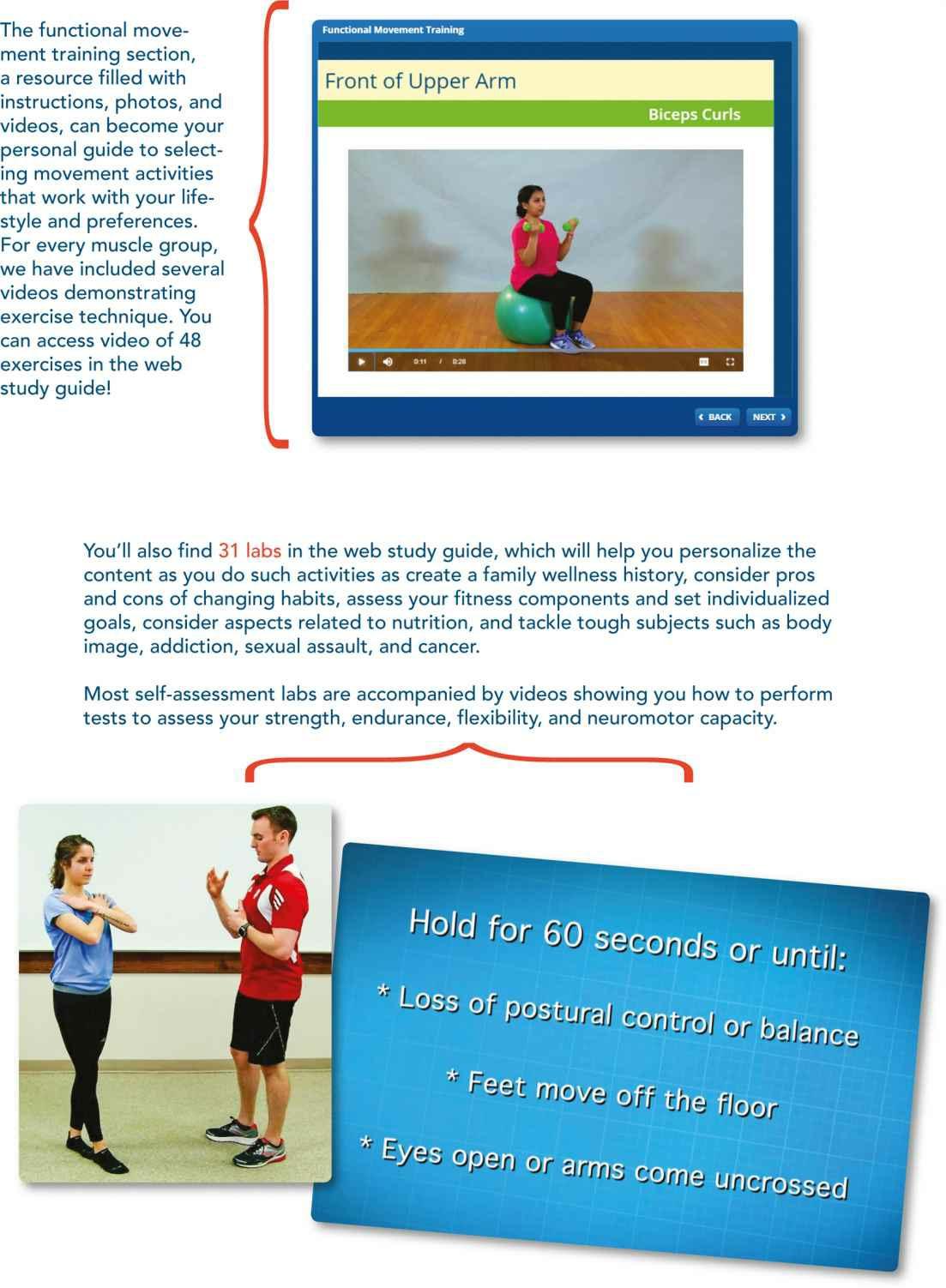 yourself, rather than comparing to others’ scores. The labs provide an opportunity for goal-setting over the course of a quarter, semester, or an entire year, even after you have finished the course. These labs can be downloaded, completed, and then submitted to your instructor through a learning management system Finally, the web study guide contains a functional movement training section, which provides instructions, photos,andvideosdemonstratingexercisetechniquesforallmajormusclegroups.