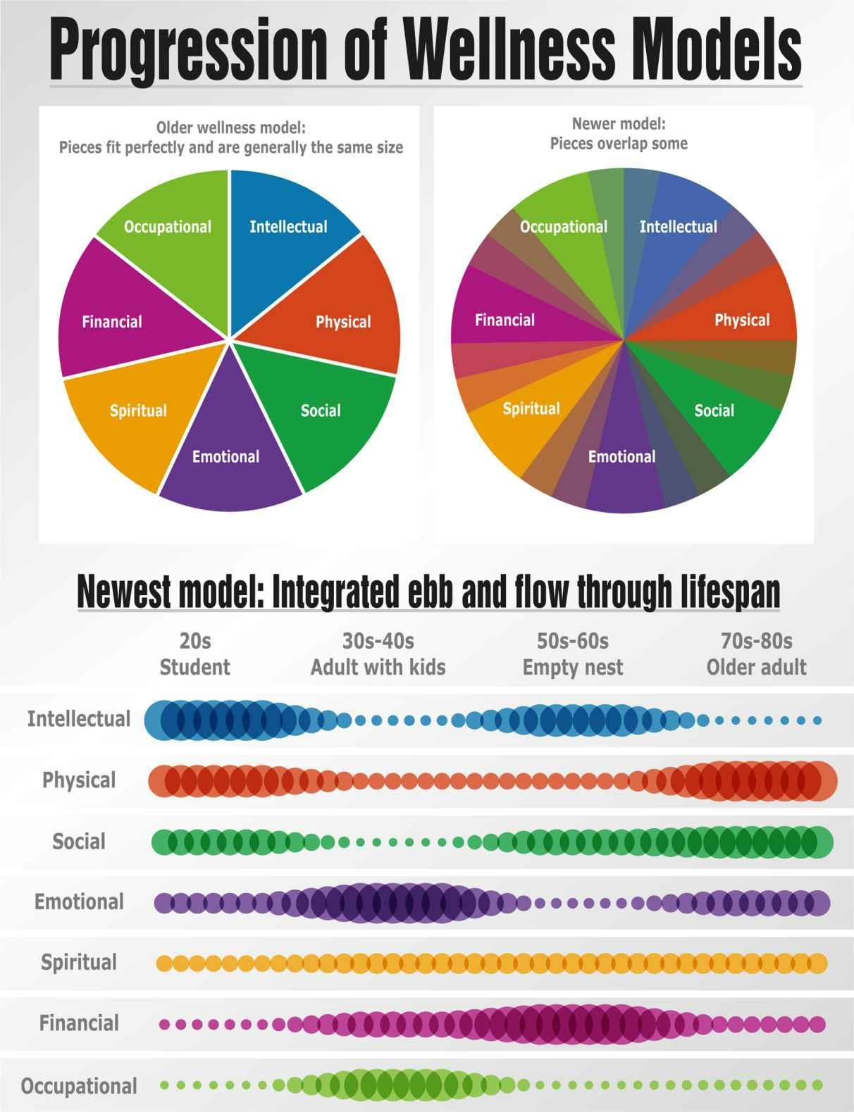 A contemporary wellness focus encourages taking charge of one ’ s health and wellness in order to enhance life expectancy In addition to Dr Travis’s iceberg model, there are many other ways to break down wellness into workable pieces See figure 16 for a progression of wellness models The wellness pie and puzzle are commonly used to describe how wellness all comes together. These models are limiting because the pieces fit perfectlytogetheranddonotoverlapor intermix.Thereality oflifeis notthisperfect. Habitsfromonepiece rolloverintotheotherpieces Also,atanygiventime,wemaybeworkingmoreononepieceofwellnessthan another Forexample,acollegestudent’swellnessfocuswouldbemoreontheintellectualandsocialpiecesof the pie, while the occupational and environmental pieces may take a backseat until graduation. In our 30s or 40s,ourfocusisonemotionalandoccupationalwellness(marriage,kids,andwork).Inour50sand60s,when our kids leave home, there is more time for environmental discovery (eg, cruises and hikes) Finally, in our 70sand80s,thesocialandintellectualbecomemoreimportanttopreservetowardtheendoflife Throughout all of life, the physical, spiritual, and financial pieces are staples. Without these three pieces, it would be difficulttomovethroughlifeandbehappy,stable,andwell.Onanothernote,weallhaveourwellnessmodel preferences thecomponentsofwellnessthatareimportanttousateachparticularstageinlife