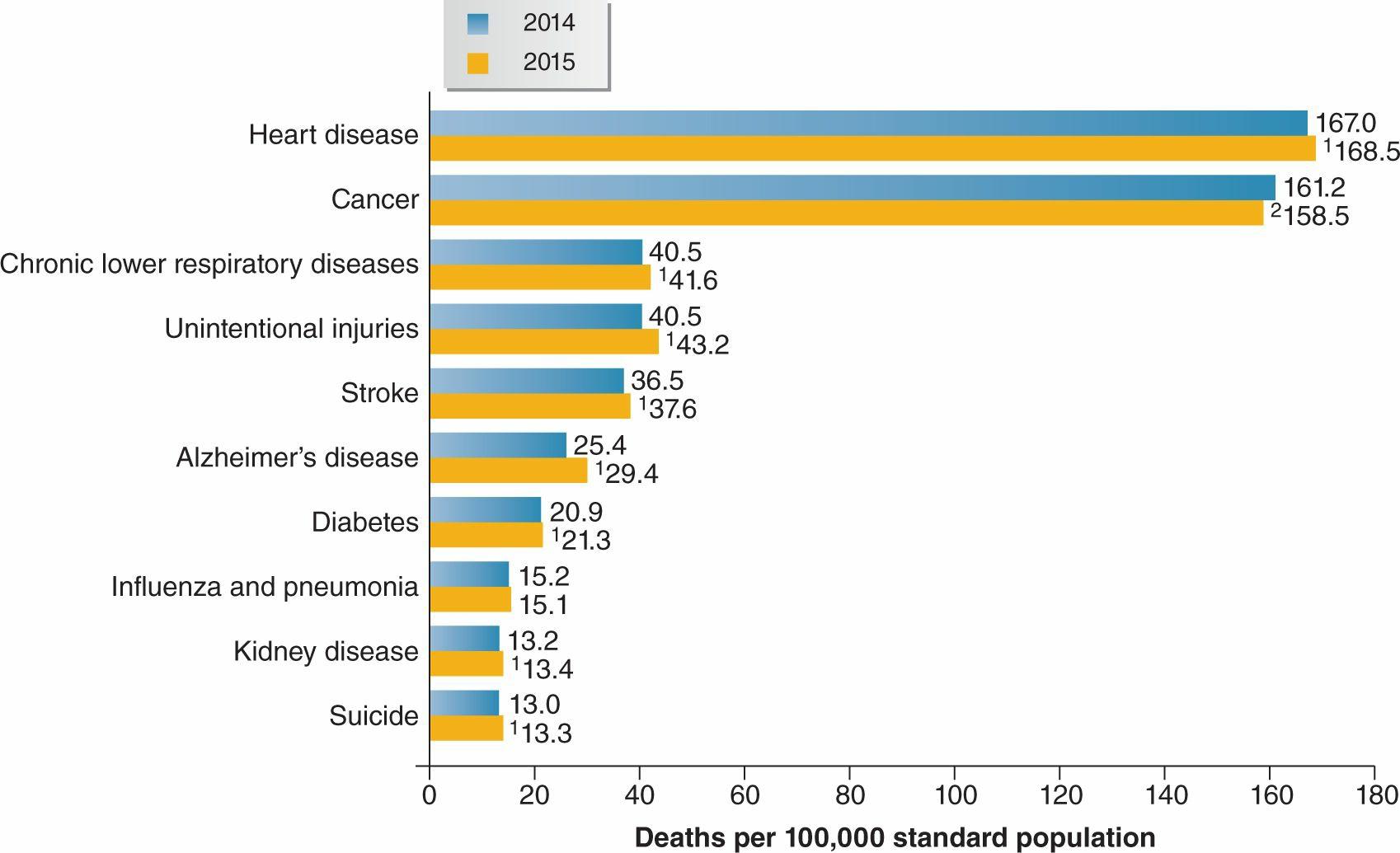 The top 10 list of leading causes of death in the United States has not changed since 2014, and 7 of the causesarechronicdiseases Thetoptwo(heartdiseaseandcancer)accountforover60percentofdeathsfrom thosecausesintheUnitedStates(figure11)