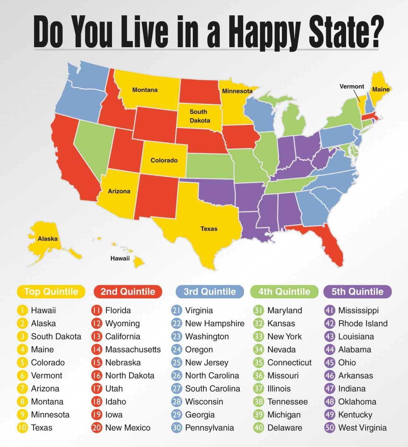 information, along with other factors such as crime, commute time, unemployment, and cost of living, to determine the happiest and saddest states According to Hauser (2016), Hawaii was where the happiest people lived and West Virginia was where the saddest people lived. Khalid (2016) agreed that West Virginia wasthesaddeststateandfoundUtahtobethehappieststate Figure14outlinesthetop10happieststatesin theUnitedStates