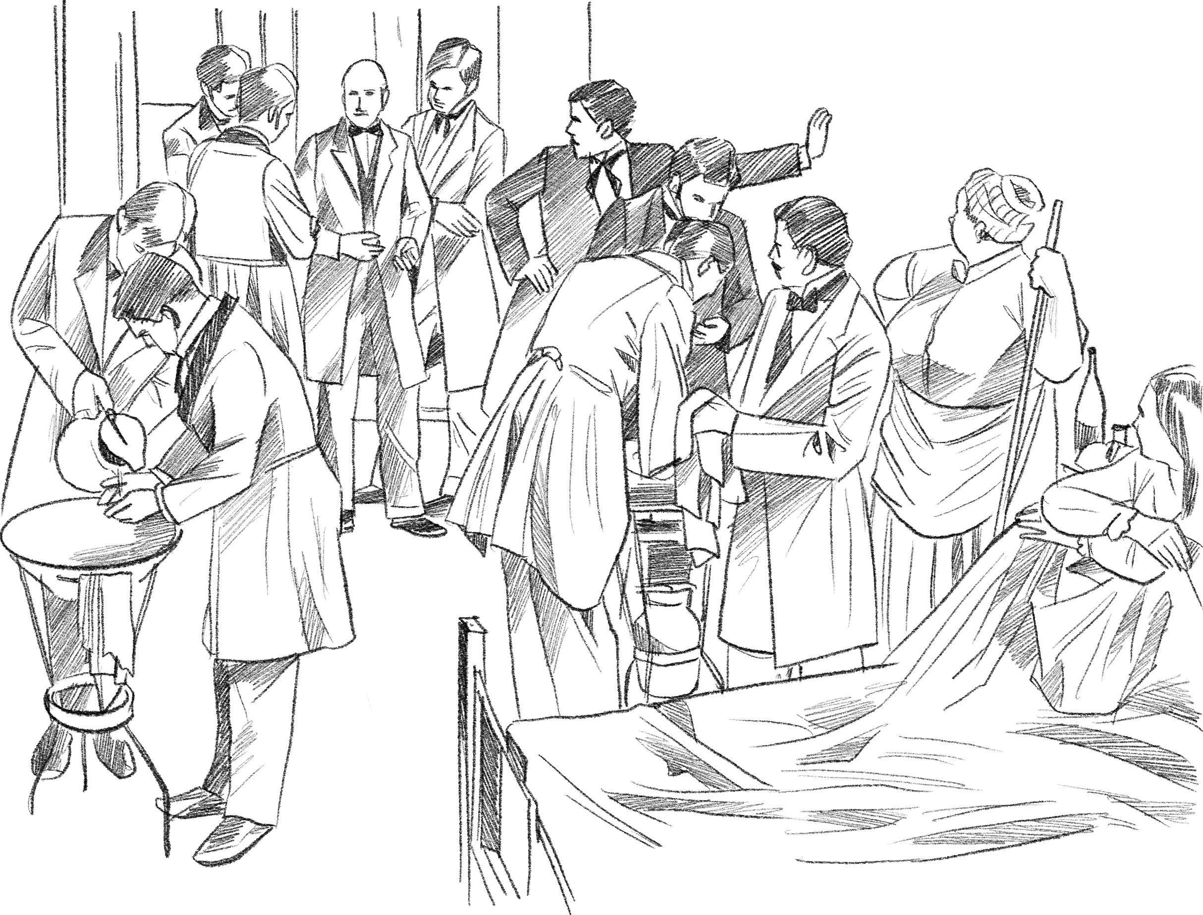 Hegraduallycametotheconclusionthatthings,whichhetentatively called“cadaverousparticles,”werebeingcarriedbythestudentdoctorsfrom thepost-mortemsaroundthehospital.Thestudentdoctorsexamineddiseasedbodiesinthemorgueandthenwalkedovertoseepatientsonthe wards.Today,wewouldcallthatprocesscross-infection,butSemmelweis hadnosuchmodernconceptstounderstandwhatwasgoingon.Nevertheless,heinstitutedhandwashingtostoptheparticlesgettingaround (figure 2.1).Thedeathratedulyratewentdown.