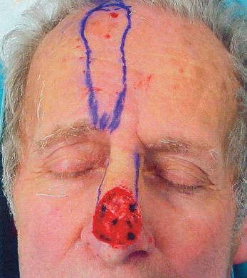 Fig. 2.3 Measuring the flap length to width. By including a large bore artery (the supratrochlear artery) in the flap pedicle, the ratio may be at least as great as 4 : 1 as shown in the preoperative photo (A) and afte suturing (B)