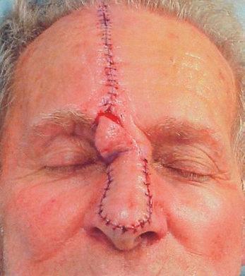 Rotation flaps are most often used for repairs of the scalp, forehead, cheek, and nose. The Rieger flap,89 or dorsal nasal rotation flap, uses a back-cut in its design to allow closure of small- to medium-sized defects of the distal third of the nose. In 1985 Marchac and Toth modified the flap design by defining an axial pedicle for the flap based on the angular artery.90 This modification allows a greater flap length-topedicle base ratio because of a reliable blood supply. Multiple rotation flaps may be used to repair large defects on the chin, forehead, and nasal tip. When two mirror-image rotation flaps are designed to repair the defect, the closure is called an O-to-Z repair. There are a few specialized forms of bilateral rotation flaps that have also been reported: the Peng flap for the nose and the bilateral vermillion flap on the lip. 92 When three or more rotation flaps are used, it is often referred to as a pinwheel flap.