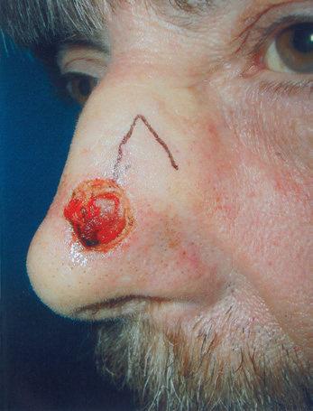 Fig. 2.7 This lateral cheek rotation flap illustrates how the flap is rotated in an arc along a pivot point to fill the adjacent primary defect without crossing any other intervening skin.