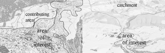 FIGURE2.2 Systemdelimitation.Spatialdelimitationofthesystemconsideredinfloodrisk analysis.Left:theareaofinterestforriskanalysisplusthecontributingareasforsurfacewater floods.Right:theareaofinterestplustheupstreamcatchment.Backgroundmapfrom map.geo.admin.ch.