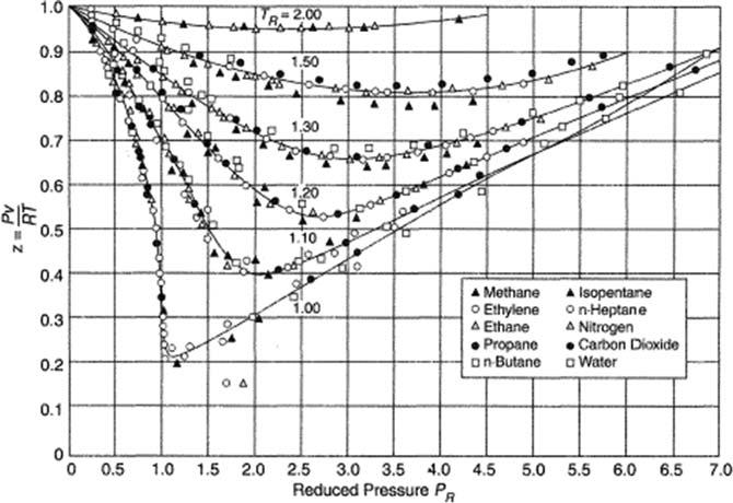 Theprincipleofthecorrespondingstateshasbeenhistoricallyrepresentedbydrawingthecompressibilityfactor Z asfunctionofreducedpressureandtemperature,asshownin Fig.1.2,wherethecompressibilitydata forseveral fluidshavebeenreported.