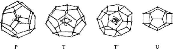 Whileinvestigatingdimethylether(DME)hydrateusingX-raydiffraction, Udachinetal. [5] identifiedanothernewhydratestructureTthatisdenseand highlycomplex(Fig.1.4).Itdoesnothave512 polyhedraandcancontain 51263(P),51262(T),4151063(T’)and425861(U)cages.Thishydratestructureistrigonal,spacegroupP321,a 5 34.995A ˚ ,c 5 12.368A ˚ ,andstoichiometrycanbe describedas12P 12T 24T 12U 348H2O.TheDMEmoleculesareaccommodated inallthreetypesoflargecages(P,T,T’)(Fig.1.5),givinganoverallcompositionofDME 7.25H2O.