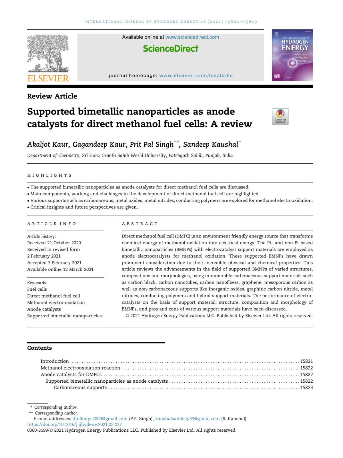 Supported bimetallic nanoparticles as anode catalysts for direct methanol fuel cells: A review Akaljot Kaur & Gagandeep Kaur & Prit Pal Singh & Sandeep Kaushal