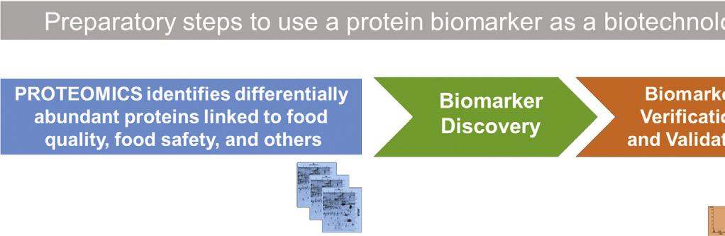 proteins for food traceability as well as food quality and safety detecting allergens or microbial contaminants is the way forward (Cunsolo, Muccilli, Saletti, and Foti, 2014). To fulfill this goal, the proteomics has been developed to find biomarkers for predicting sensory and technological quality traits of foodstuffs along with a better understanding of molecular mechanisms (Gagaoua et al., 2021; Huang et al., 2020). A biomarker is related to a functional, physiological or biochemical process at the cellular and molecular level influencing a specific feature (Strimbu and Tavel, 2010). A protein biomarker is an indispensable tool to monitor and predict these quality traits but a large amount of information and preparatory steps including, verification and validation, should be achieved (Fig. 1.2).