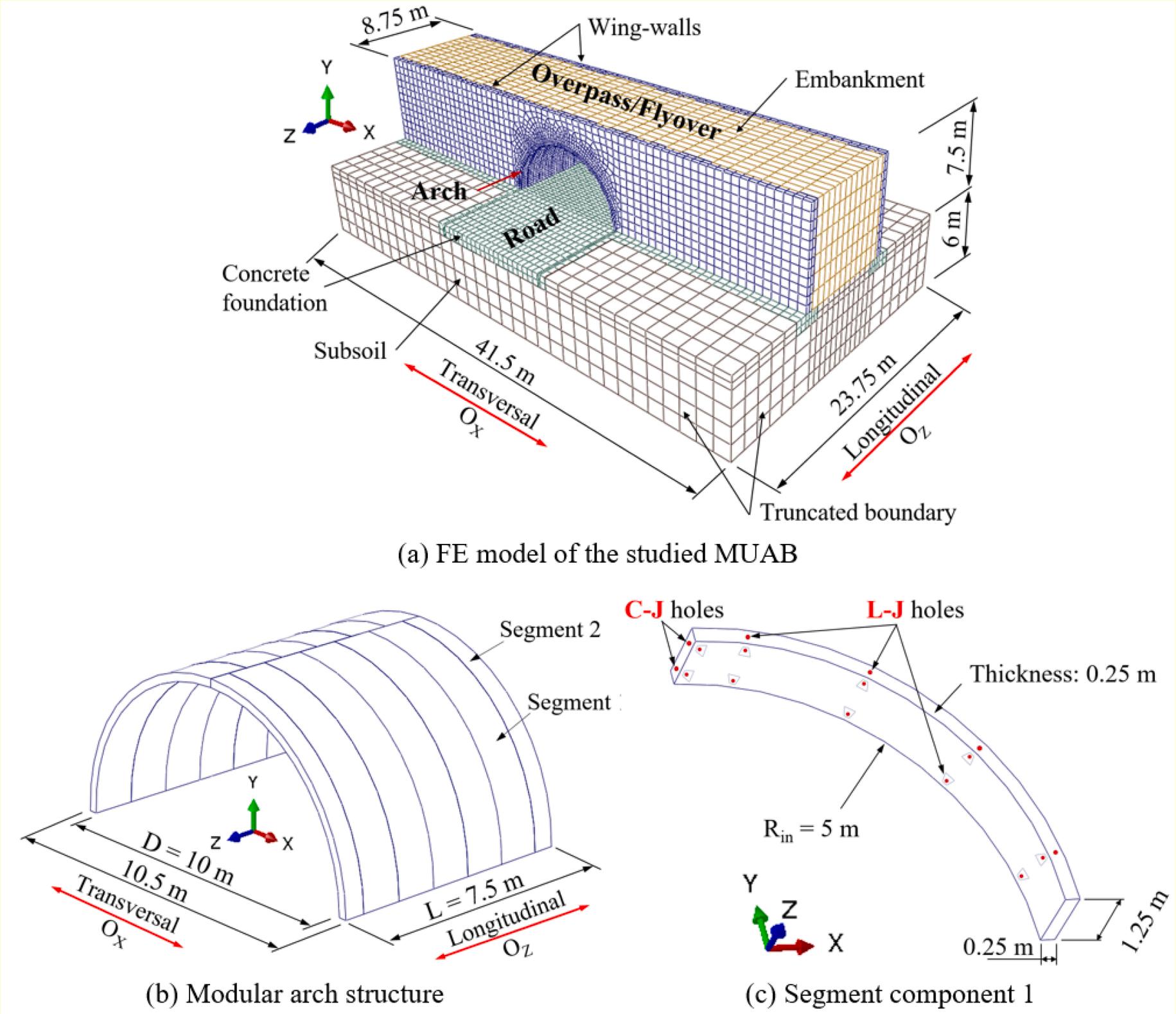 For underground arch bridges (UABs), Argyroudis et al. [61] used the same method with UBBs. However, the studies mentioned above are based on two-dimensional (2D) FEA models of underground bridges [58–61] Hence, ground motions in all horizontal directions have not been considered. The seismic resistance of MUABs between the longitude and transversal direction differs considerably [23,46] The ratio of the maximum bending moment on the arch to its capacity is widely used to determine damage states. The arch structure cannot withstand a loading combination of static and dynamic loads at a single bending