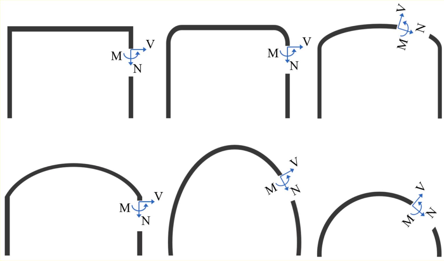 Fig. 2. Various cross-section shapes of MUABs correspond with their internal-force combination from thrust (N) and/or shear force (V) and/or moment (M).
