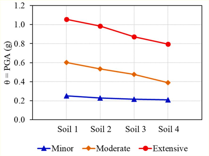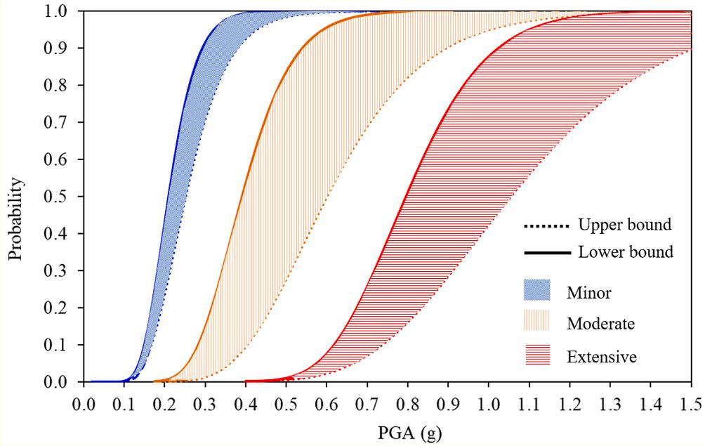 In the fragility-based approach, seismic fragility curves corresponding to the variance in the damage index with an increase in the intensity measurement for various levels of damage states (DSi) are plotted. Thus, the damage states represent the damage condition of MUABs associated with a limit state of the structural response.