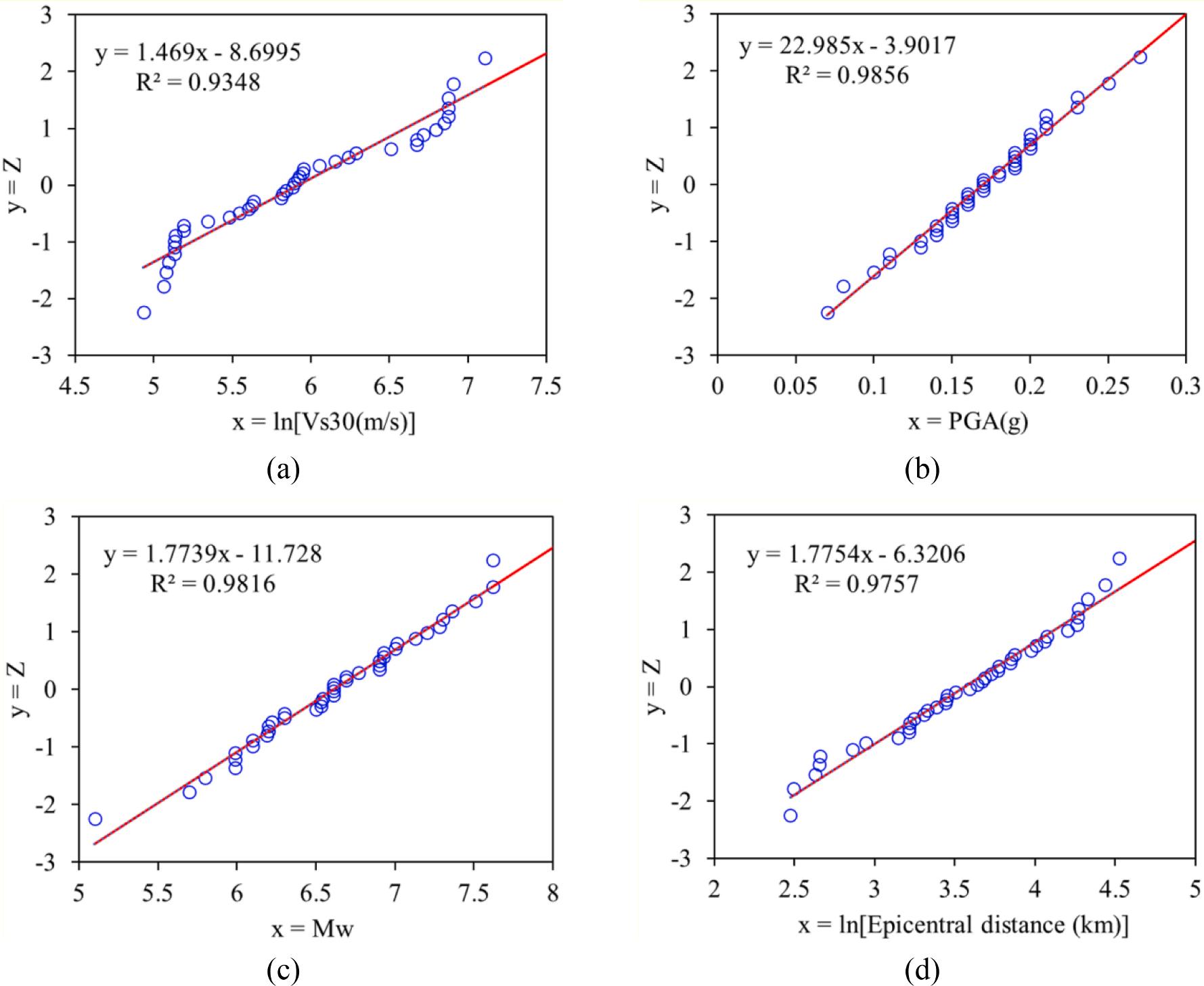 where IM is the intensity measure of ground motions; a and b are unknown regression coefficients obtained from linear regression analysis.