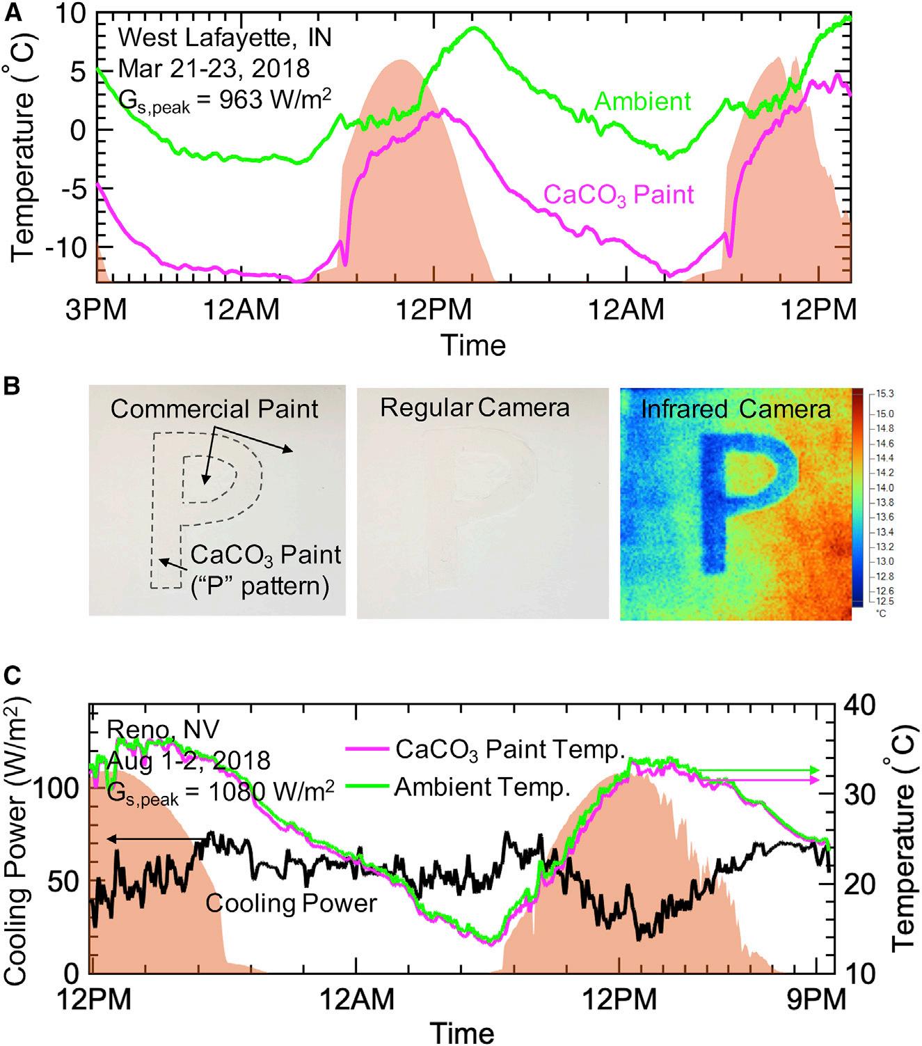 AfieldtestofsurfacetemperaturesdemonstratedfulldaytimecoolinginWestLafayette,IndianaonMarch21–23,2018,asseenin Figure3 A.Thesamplestayed10 C belowtheambienttemperatureatnight,andatleast1.7 Cbelowtheambienttemperatureatapeaksolarirradiation 963W/m2 .Therelativehumidityat12p.m.was 40%withtotalprecipitablewaterof1,613.5atm-cm.Inanotherdemonstration,a ‘‘P’’patternwaspaintedwiththeCaCO 3 -acrylicpaintandtherestwaspaintedwith commercialwhitepaintofthesamethickness.Itwasthenplacedunderdirectsunlight.Asshownin Figure3B,thepatternwasnearlyinvisibletoaregularcamera sincebothpaintssharehighreflectancesinthevisiblespectrum(0.4–0.7 m m).However,itbecamemuchmoredistinctivetoanIRcamera,clearlyshowingthatthe CaCO3 -acrylicpaintwasabletomaintainalowertemperatureunderdirectsunlight comparedtothecommercialwhitepaint.Thecoolingpowermeasurementusinga feedbackheaterin Figure3Cshowedanaveragecoolingpowerof56W/m 2 during nightsand37W/m 2 at 12p.m.(between10a.m.and2p.m.)inReno,Nevadaon August1–2,2018,whentherelativehumiditywas10%at12p.m.withtotalprecipitablewaterof1,755.7atm-cm.Adetailedanalysisofthecoolingpowerandcomparisontoexperimentaldataareprovidedin NoteS2 and FiguresS2 and S3