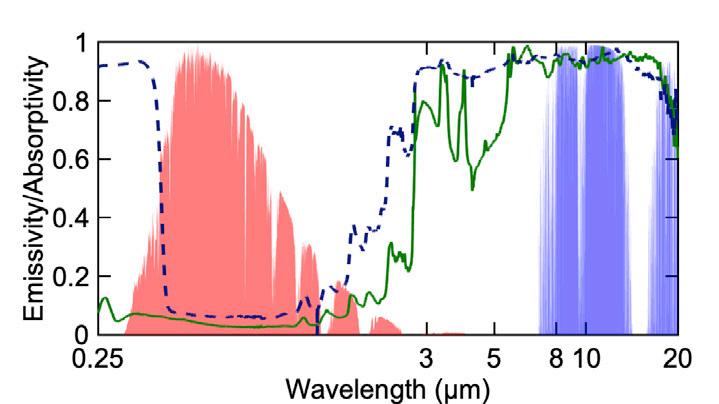 Coolingrepresentsasignificantsectorof energyconsumptioninbothresidential andcommercialapplications.1 Passiveradiativecoolingcancoolsurfaceswithout anyenergyconsumptionbydirectlyemittingheatthroughatransparentspectral windowoftheatmosphere,from8to13 m m(the‘‘skywindow’’),tothedeepsky, whichfunctionsasaninfiniteheatsink,withatemperatureof3K.By‘‘skywindow,’’ weparticularlymean8to13 m m,whichisalsothewidelyusedconvention.Othersky windowscouldbespecifiedsuchasthesecondskywindow,andsoforth.Ifthethermalemissionofthesurfacethroughtheskywindowexceedsitsabsorptionofthe sunlight,thenthesurfacecanbecooledbelowtheambienttemperatureunder directsunlight.Comparedtoconventionala irconditionersthatconsumeelectricity andonlymoveheatfromtheinsideofthespacetotheoutdoors,passiveradiative coolingnotonlysavespowerbutitalsocombatsglobalwarmingsincetheheatis directlylosttothedeepspace.