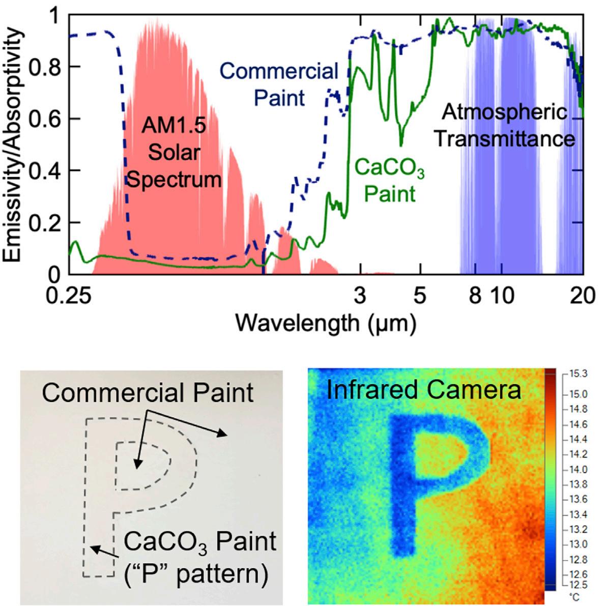 (B)A‘‘P’’patternpaintedwiththeCaCO 3 -acrylicpaintandtherestwiththecommercialwhitepaint wasplacedunderdirectsunlight.Thepatternwas nearlyinvisibletoaregularcamerabutbecame muchmoredistinctivetoaninfrared(IR)cameraduetothelowertemperatureoftheCaCO 3 -acrylic paint.
