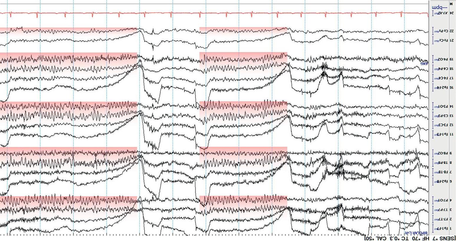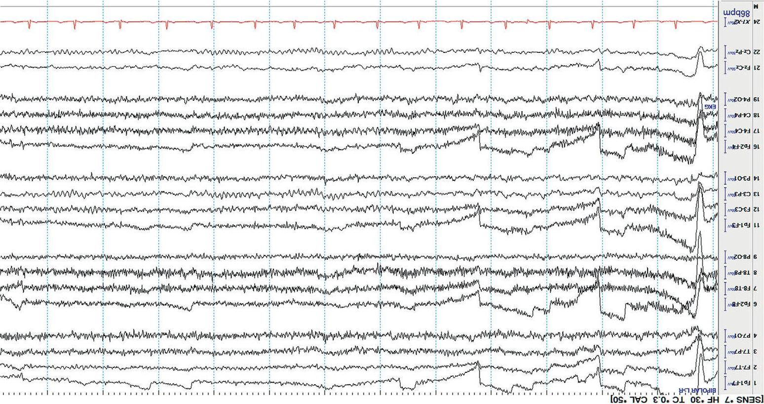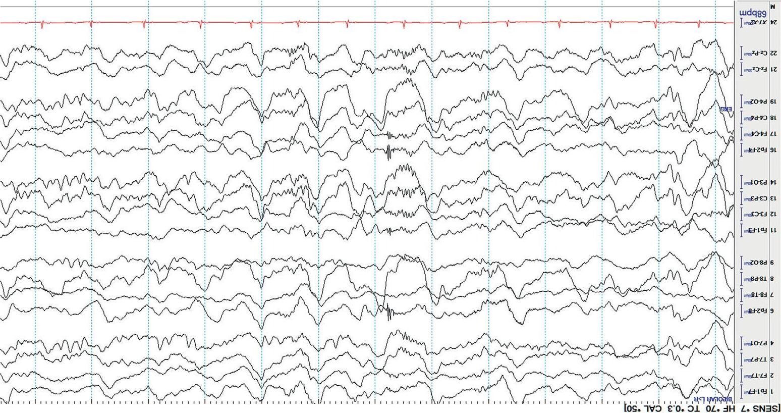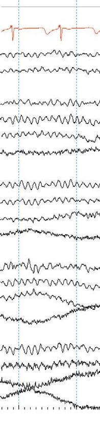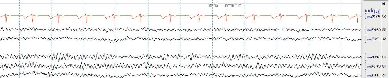 Asthepatientbecomesdrowsy(N1sleep),the alpharhythmscanslowand becomemoreintermittent,thebackground amplitudedecreases,the frequencyslows,and slowlateral(“ roving ”)eyemovements canappear. Eyeblinksandmuscleartifactdisappear. Figure1.7 showstheEEG duringdrowsiness.