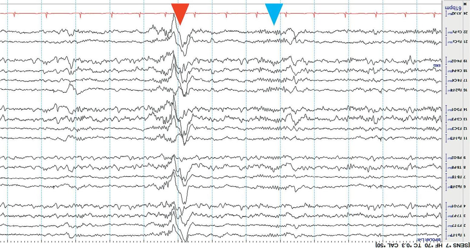 Figure1.8(a) NormalstageN2sleep;thebluearrowmarksanormalsleepspindle,andtheredarrowmarksanormalK-complex.