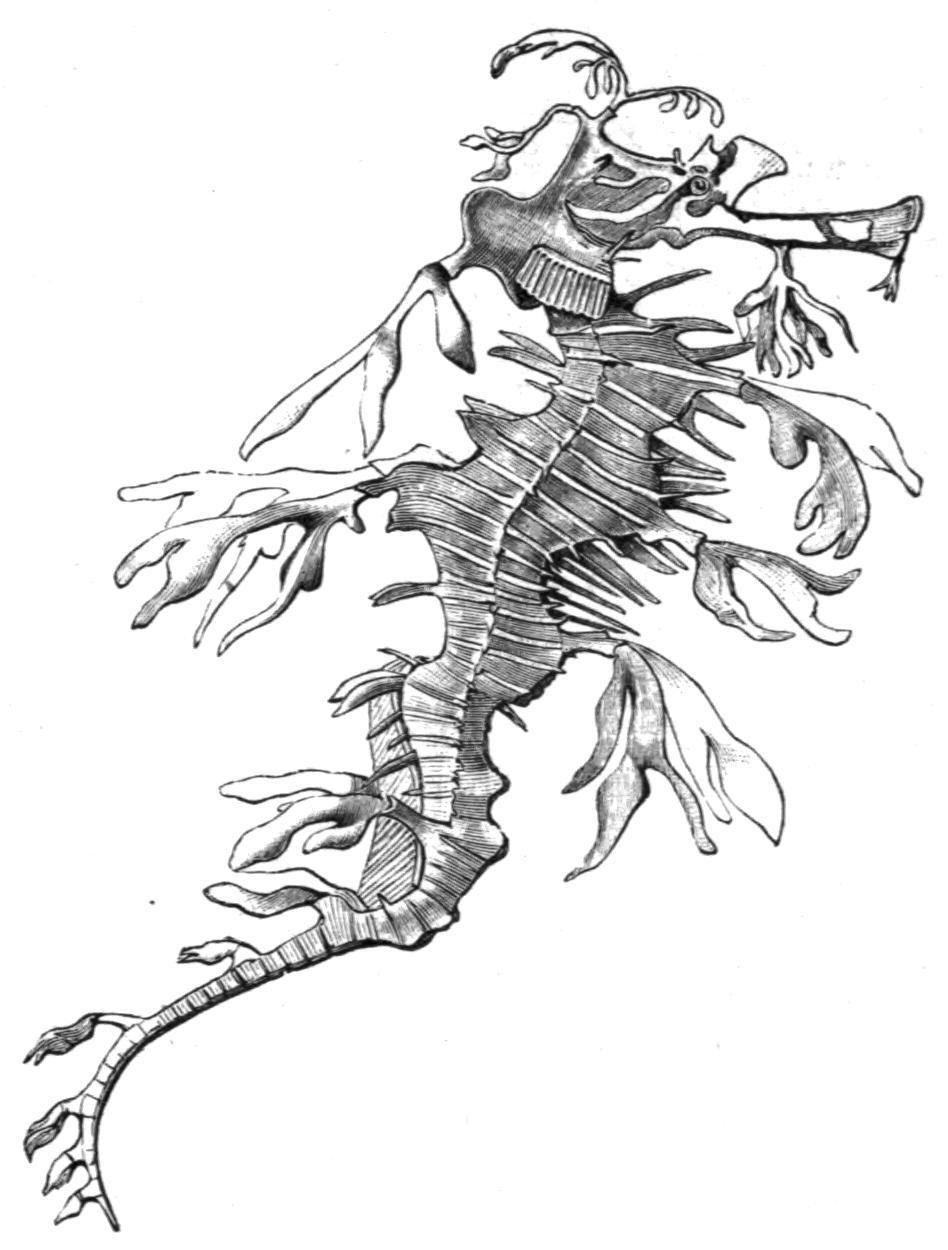One of the most remarkable types of Syngnathids is Phyllopteryx, from Australia. The spines and knobs of the head and body are furnished with dermal appendages, which closely imitate the fucus among which they live.