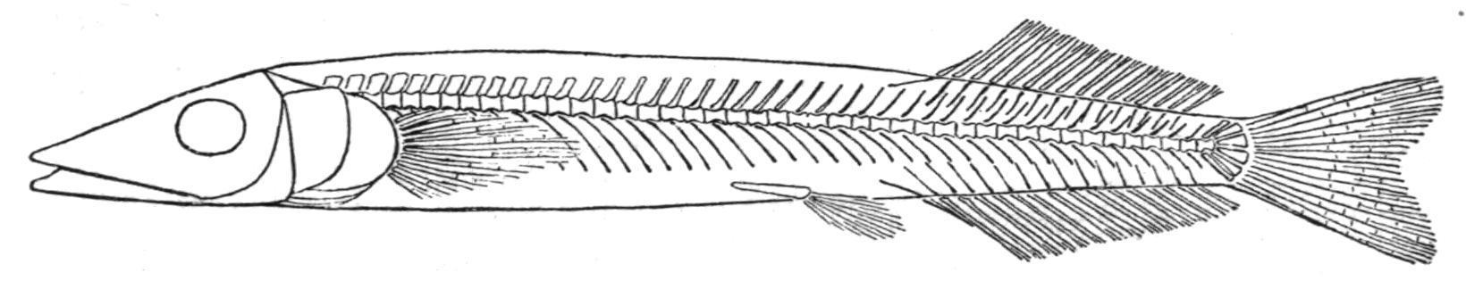 Fam. 2. Ammodytidae.—Maxillary excluded from the border of the upper jaw; mouth protractile; dentition feeble or absent. Lower pharyngeal bones separate. Praecaudal vertebrae without parapophyses. Body covered with very small cycloid scales. Pectoral fins nearer the ventral than the dorsal line; ventral fins, if present, widely separated from the pectorals, without spine, with 6 rays. Dorsal and anal fins more or less elongate, formed of soft rays. Airbladder absent.