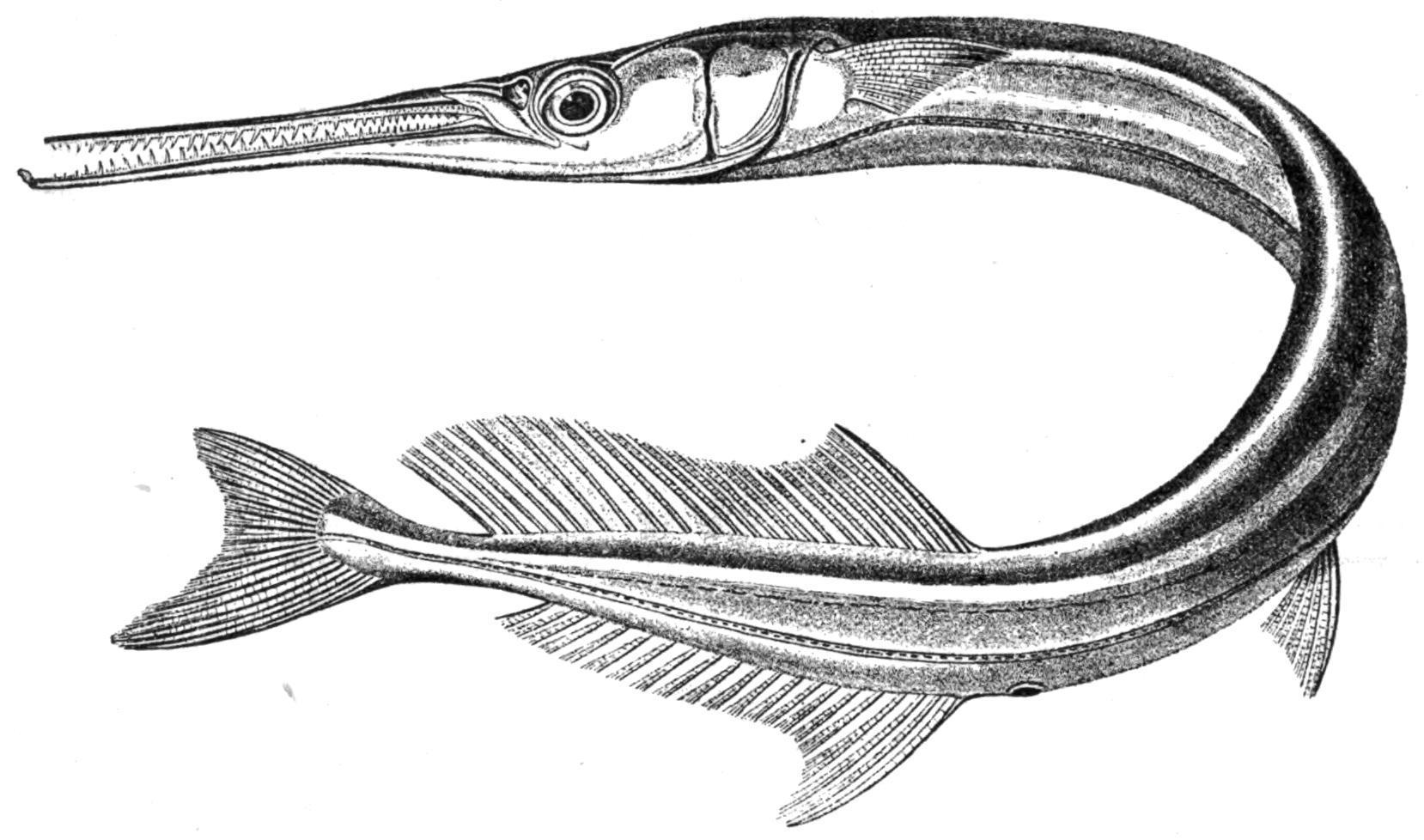 The Flute-mouths, Fistularia, which Dr. Günther describes as "gigantic marine Sticklebacks living near the shore, from which they are frequently driven into the open sea," are represented by three species, from the tropical and subtropical parts of the Atlantic and Indo-Pacific. The middle rays of the forked caudal fin are produced into a long filament. The largest species, F . tabaccaria, reaches a length of 6 feet. The same genus is represented by two species in the Upper Eocene and Oligocene of Europe, and Urosphen, from the Upper Eocene, is regarded as allied to it.