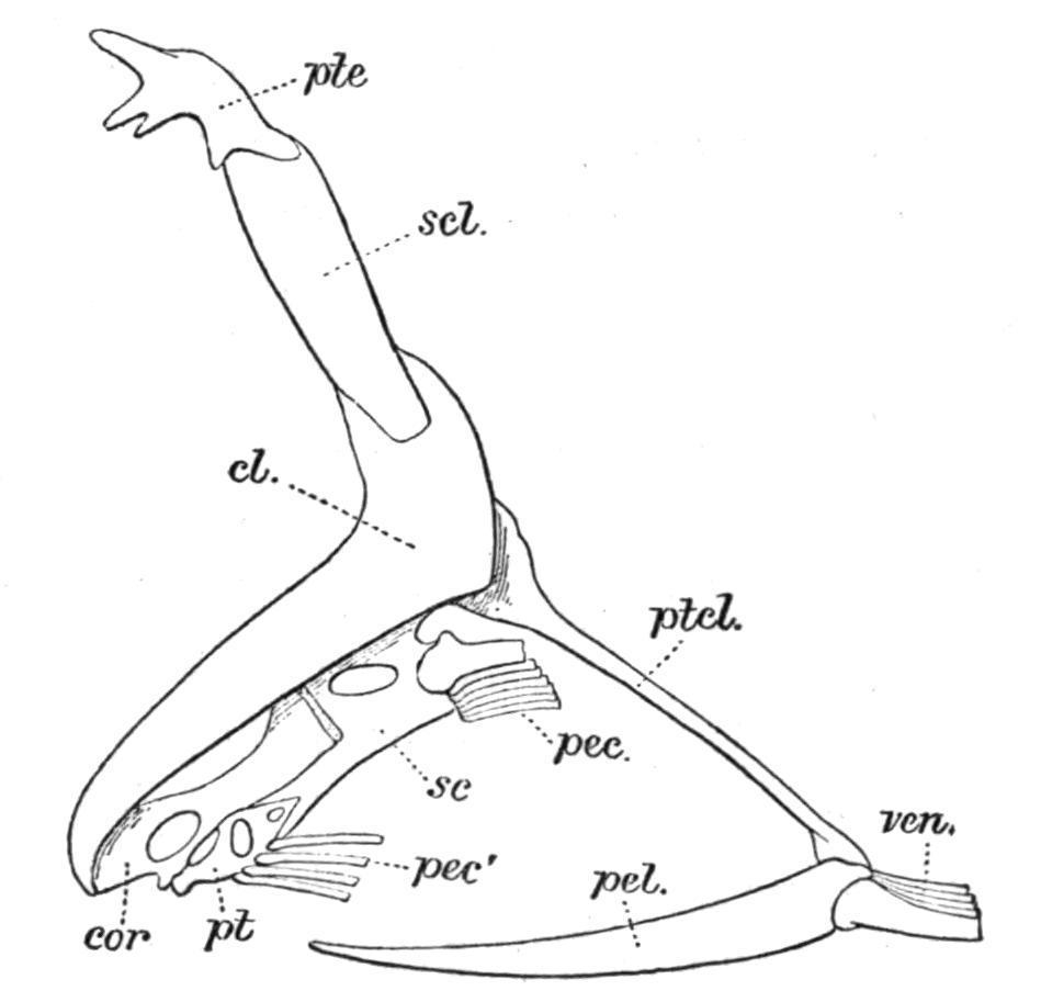 FIG. 391. Shoulder-girdle and pelvis of Polynemus quadrifilis. cl, Clavicle; cor, coracoid; pec, pectoral rays; pel, pelvis; pt, pterygials; ptcl, post-clavicle; pte, post-temporal; sc, scapula; scl, supra-clavicle; ven, ventral rays.