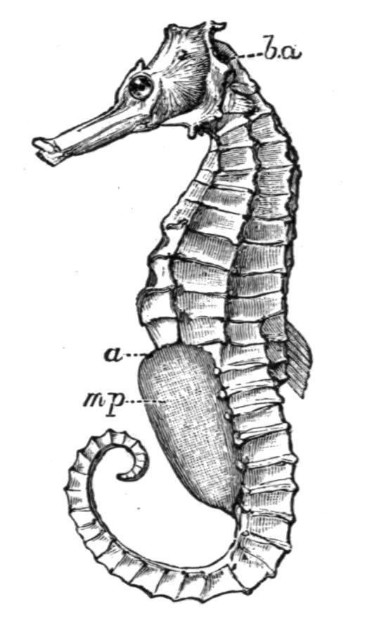FIG. 387.—Hippocampusguttulatus. Male, showing brood-pouch (mp). a, Anus; b.a, branchial aperture.