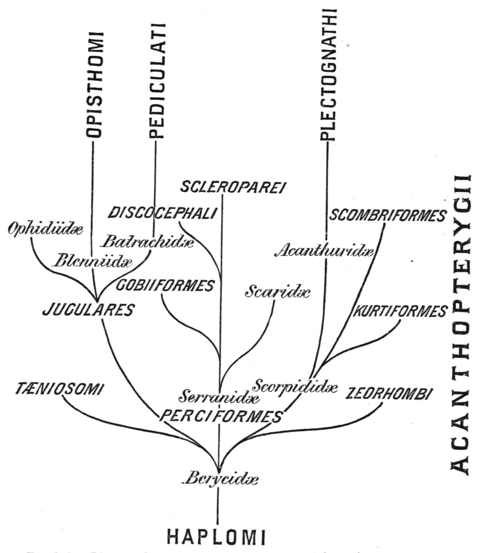 The character from which this sub-order, the most comprehensive of the whole class, derives its name, viz. the presence of nonarticulated, more or less pungent, rays in the dorsal and anal fins, is by no means universal, exceptions to the rule being numerous. The mouth is usually bordered by the premaxillaries to the exclusion of the maxillaries, and if these should, by exception, enter the oral edge, they are always toothless. The ventral fins are sometimes inserted at some distance behind the base of the pectorals (Haplodactylidae, Platycephalidae), in which case, however, this is due to the elongation of the pelvic bones, which are solidly attached to the clavicular arch. The sub-order is broken up into divisions, which follow in somewhat arbitrary order, the natural affinities being opposed to a linear arrangement; the annexed diagram is intended to remedy this defect.