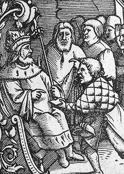 The same image used in a Yiddish translation of Sefer Yosippon printed in 1546 to depict Herod greeting the former high priest Hyrcanus. (National Library of Israel, 8-91 A 549, p. 492 [detail])