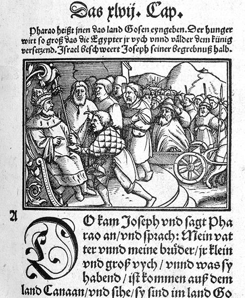 Pharaoh greeting Joseph in the Froschauer Bible. (Zurich, Zentralbibliothek, AW 14, p. xxv [detail])