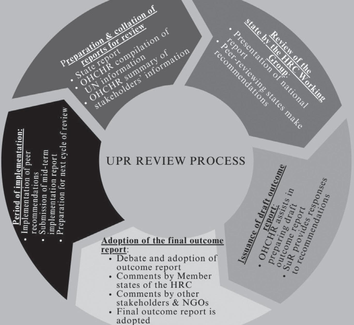 process. There are several distinct phases of the review process. These include (i) preparation and collation of reports for review; (ii) review of the state by the HRC Working Group; (iii) issuance of a draft outcome report; (iv) adoption of the final outcome report; and (v) period of implementation.