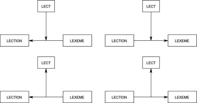 Lexemes,lections,andlectsinteract,andtalkingabouta lexeme-lection-lect triangle providesuswithahandyimagetoschematicallyrepresentthevarious aspectsofthatinteraction—orperhapsmoreprecisely,thecombinationsofthe twoperspectivaldimensionsthatweintroducedabove:seeFigure 1.1.Atthebase ofthetriangle,thedifferencebetweenasemasiologicalandanonomasiological perspectiveisexpressedbythedirectionofthearrowlinkinglexemeandlection.