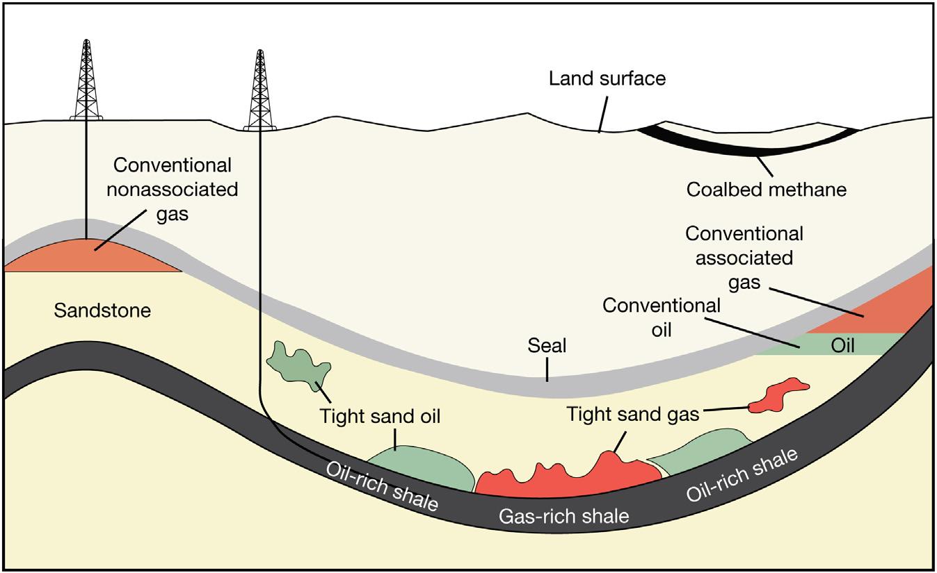 Figure 1.3 Diagram showing characteristic deposits of hydrocarbon resources below ground, including conventional oil and gas, shale and tight oil, and gas and coalbed methane. (Modified from Natural Resources Canada, 2019).